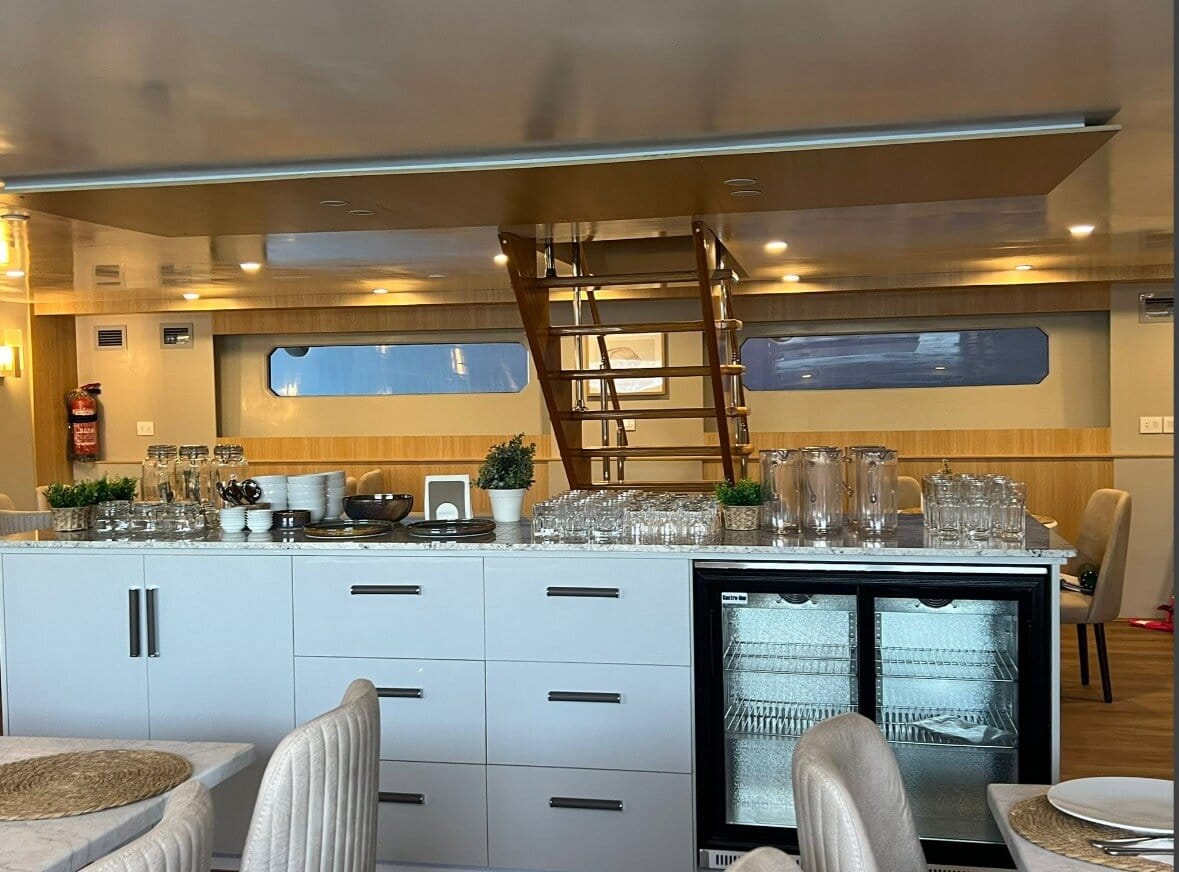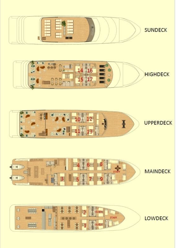 Jej 5 pokładów jest wyposażane we wszystko, co nurkom na morzu przydać się może. Jest stół na sprzęt foto. Jest indywidualnie sterowana klimatyzacja, lodówki, wygodne materace, ekspres do kawy i oczywiście nieodzowna kostkarka do lodu 😉.
