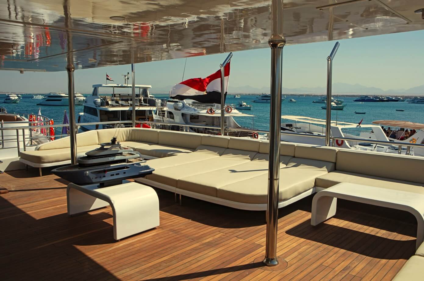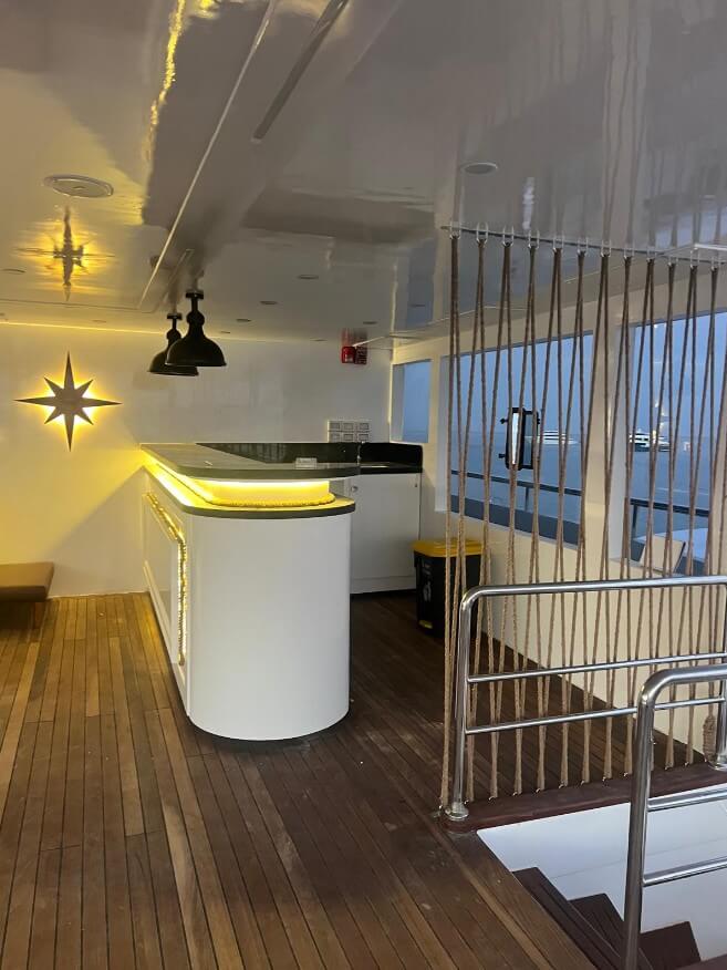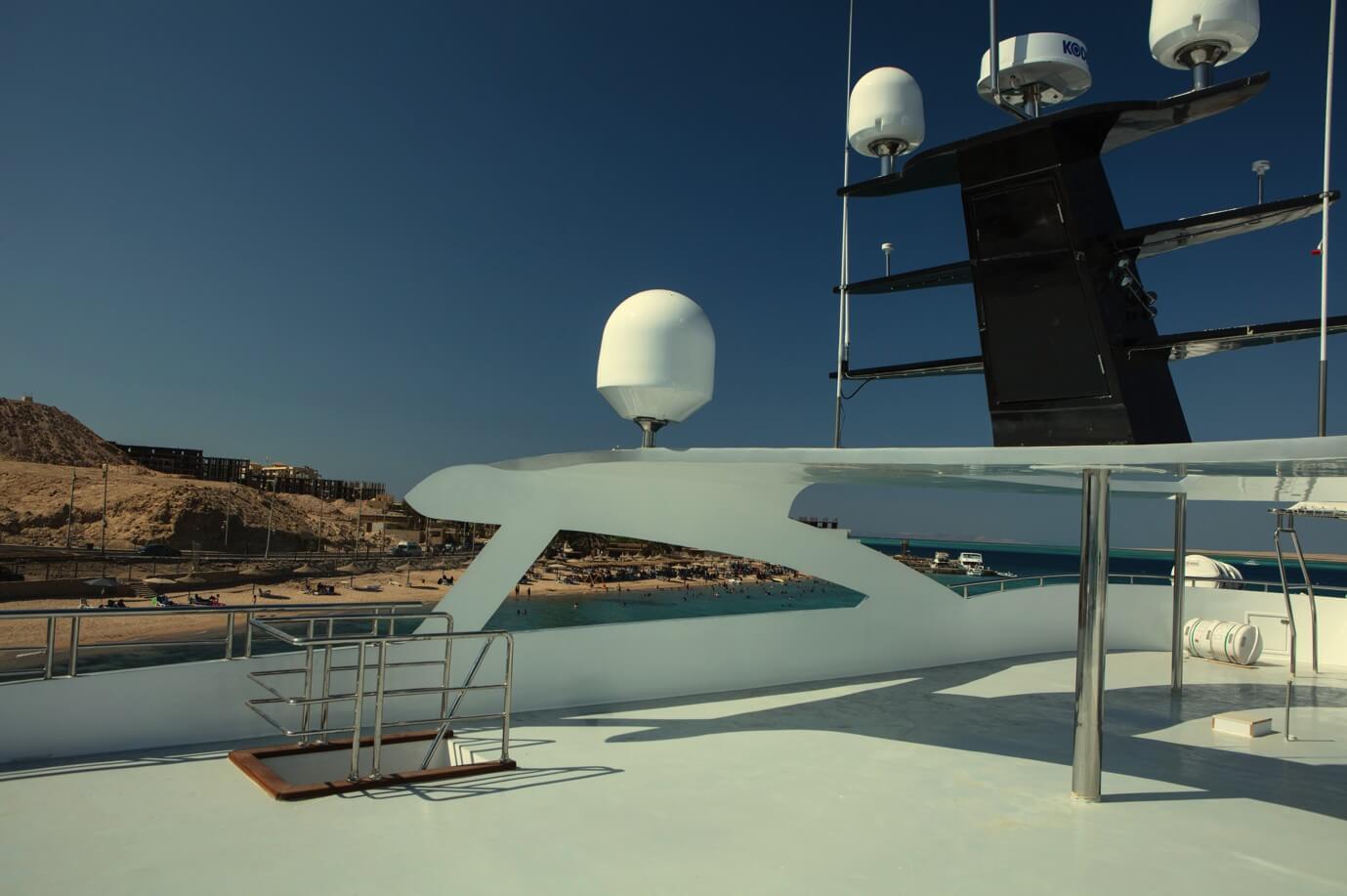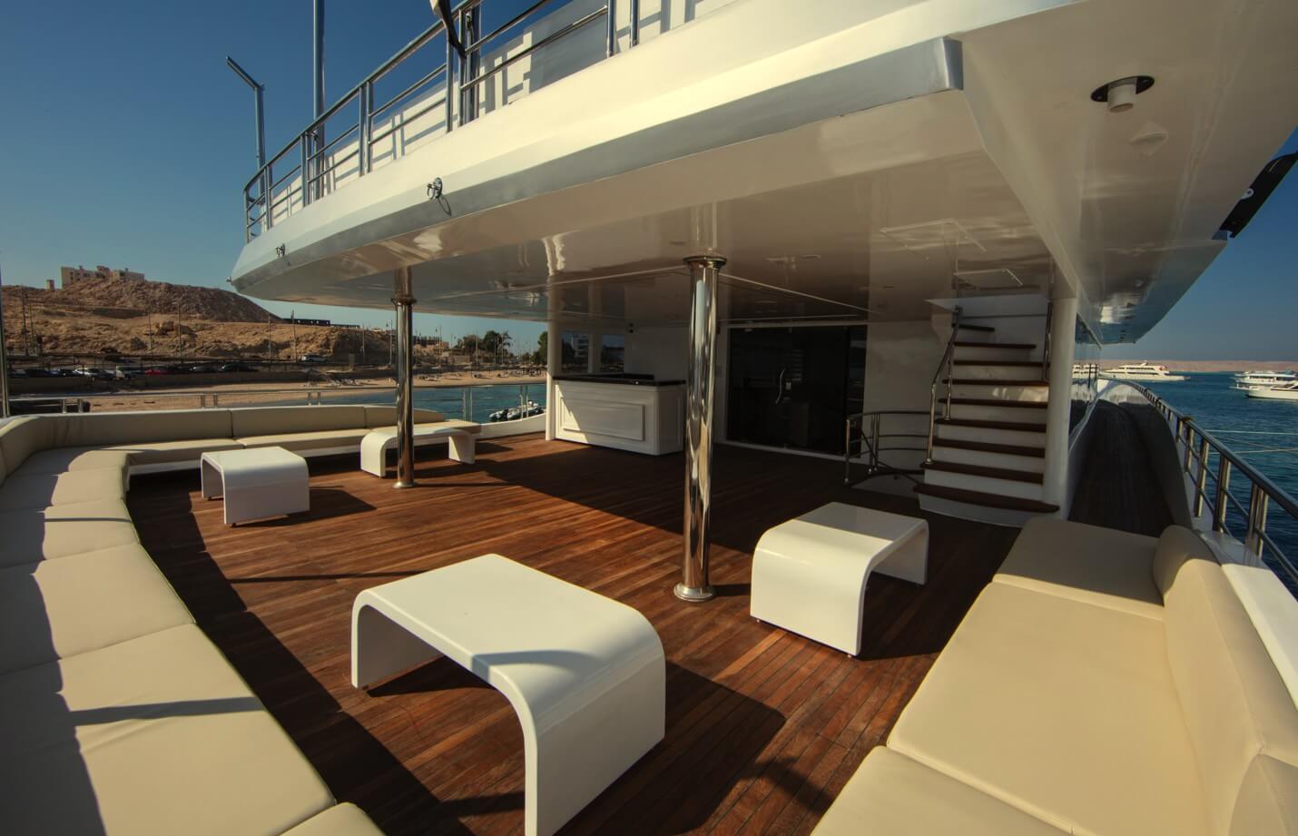 - Sundeck – serce łodzi między nurkowaniami. Strefa chill-out z leżakami, pufami i barem z zimnymi napojami.