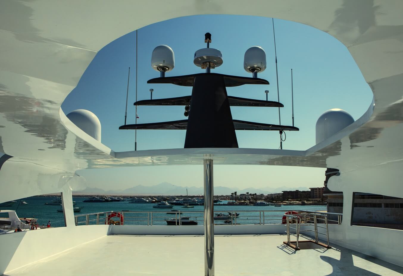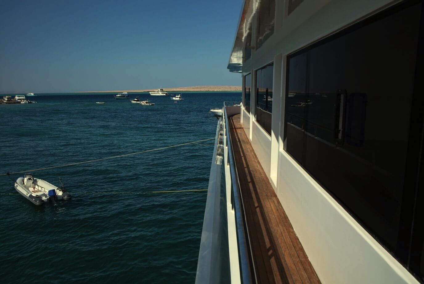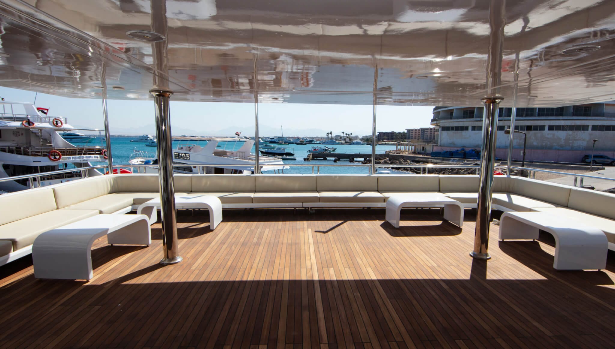 - Sundeck – serce łodzi między nurkowaniami. Strefa chill-out z leżakami, pufami i barem z zimnymi napojami.