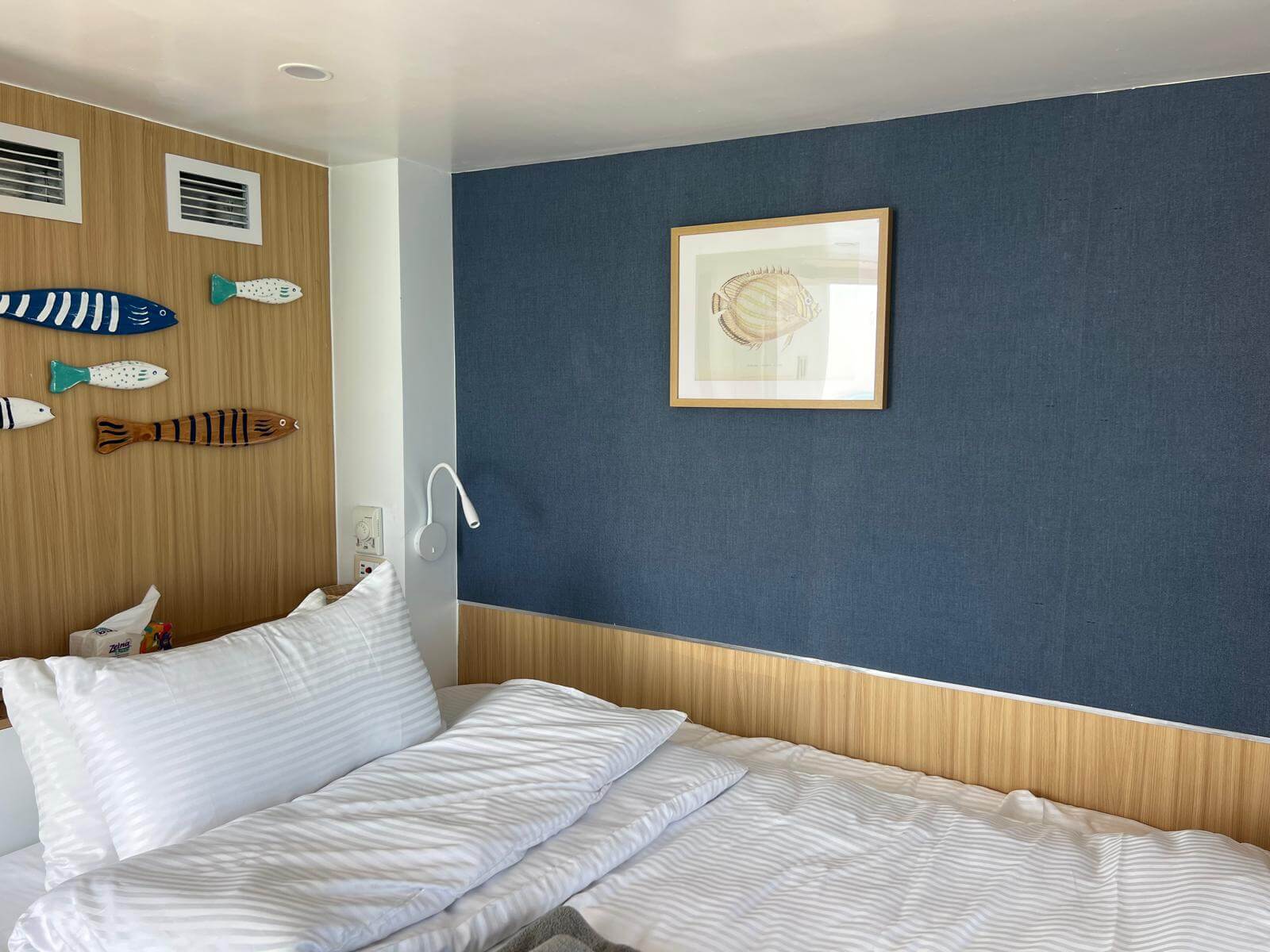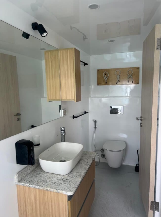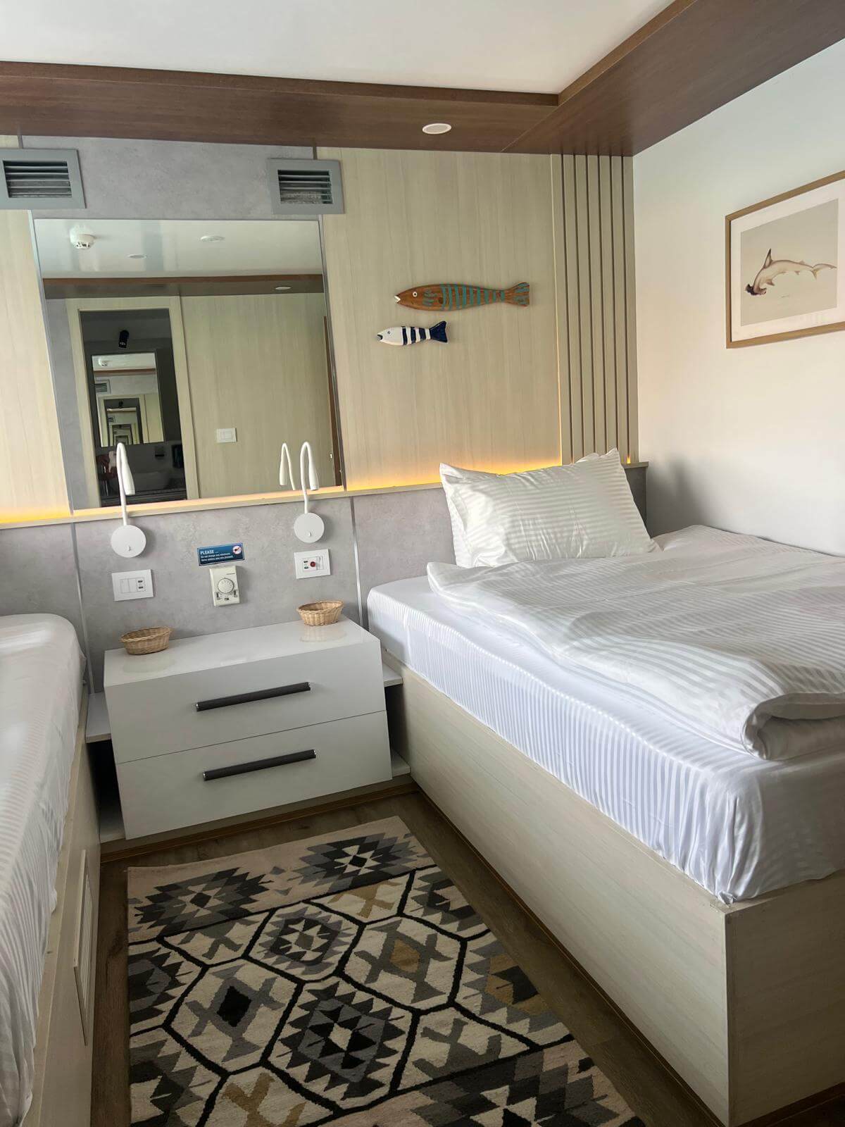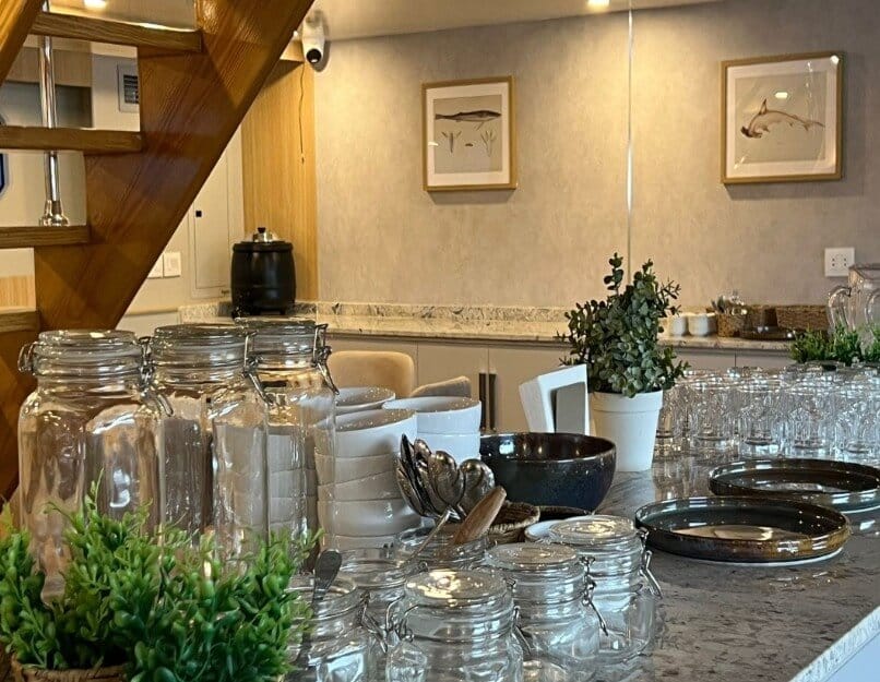 Wnętrza kabin są jasne i przytulne – wykończone w ciepłym drewnie i bieli. Każda kajuta to prywatna przystań – miejsce, gdzie możesz zamknąć drzwi, wziąć głęboki oddech i poczuć się naprawdę u siebie. Przemyślane schowki, przestronne szafy i funkcjonalne detale zapewniają komfort porównywalny z bardzo dobrym hotelem.
